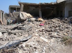 Mas era impraticável. As casas que ficavam no caminho também foram destruídas, e os escombros se espalharam sobre a única rua de acesso. Por ali não podia passar carro, nem Zakie podia caminhar sobre os destroços. A rua passa                                                   aqui: (>)
