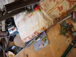 Havia soldadinhos verdes, como os dos meus filhos, um livro infantil e um caminhãozinho da polícia. Imaginei os meninos brincando ali. Talvez brincando de guerra. Quando a guerra de verdade veio e acabou com tudo.