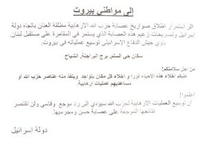 Beirute amanheceu com algumas ruas cobertas por dois panfletos israelenses. Comecemos pelo mais engraçado, que mostra que Israel está se aperfeiçoando na guerra psicológica: (>)