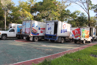 Vinte e seis caminhões pequenos de empresas de alimentos (salgadinhos, biscoitos e laticínios), 20 caminhões grandes, incluindo alguns da Coca-Cola e da Pepsi, uma carroceria de caminhão-tanque para transporte de combustível e um caminhão-pipa estão espalhados pelos campos de futebol e quadras da escola, situada em um povoado a 16 km da capital de Guerrero, Chilpancingo.