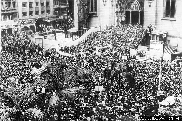 Comunismo. Em reação ao que era percebido como o risco de “comunização” do Brasil – apesar de trabalhismo e comunismo competirem entre si -, foram organizadas as “Marchas da Família com Deus pela Liberdade”, com apoio da Igreja e de setores liberais. A Marcha começou em São Paulo, no dia 19, onde reuniu entre 300 mil e 500 mil pessoas, e se espalhou por várias outras cidades, totalizando 1 milhão de manifestantes. Eles defendiam a Constituição, a propriedade e a democracia.