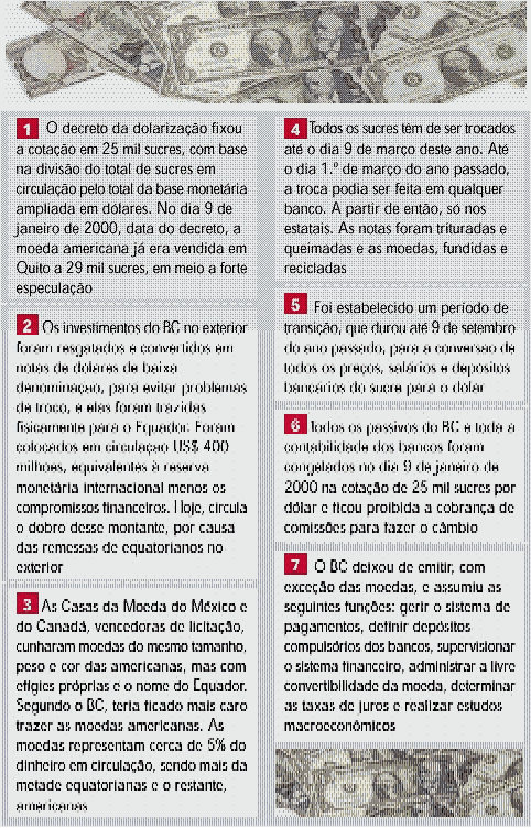 A medida extrema estancou a vertiginosa alta do dólar em relação ao sucre —de 300% nos 12 meses anteriores —, ao fixar sua cotação em 25 mil sucres por dólar, enquanto a população troca suas notas e moedas pelas americanas, até o dia 9 de março deste ano. Mas há um custo.