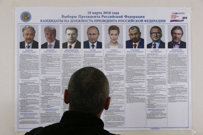 As pesquisas, em geral, atribuem entre 65% e 70% dos votos para Putin, em torno de 16% para Zhirinovsky, 10% para Grudinin e 2% para Sobchak, empatada tecnicamente com o economista liberal Grigory Yavlinsky, líder do partido Yabloko e autor do Programa 500 Dias, adotado pelo então presidente Mikhail Gorbachev na transição da União Soviética para a economia de mercado, em 1990.