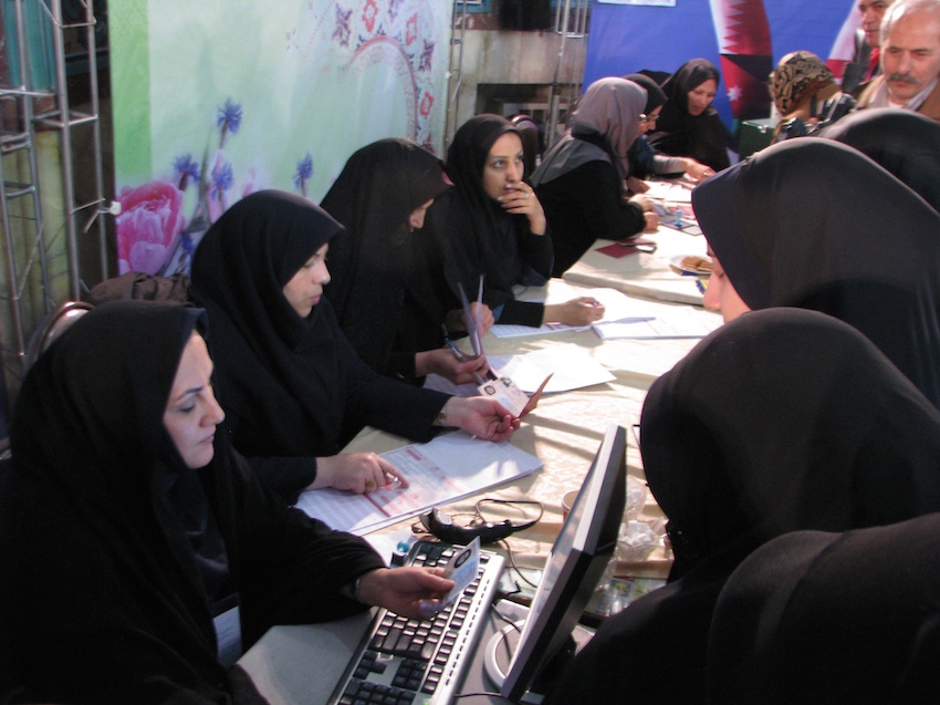 O repórter do Estado esteve entre 10 horas e 11h30 na Mesquita Husseinie Ershad, uma das principais seções eleitorais de Teerã, em área de classe média alta do centro-norte da cidade. Os eleitores chegavam e votavam, sem formar filas. Em contraste, em 2009, enormes filas saíam da mesquita o dia inteiro, dando a volta no quarteirão. Entre 12 horas e 13h30, o repórter esteve na Mesquita Imam Hussein, num bairro de classe média baixa do centro-sul de Teerã. Durante esse horário, que coincidiu com a oração do meio-dia – a mais importante da semana, – formavam-se filas de cerca de 30 eleitores. Noutras seções menos importantes, o movimento era menor.