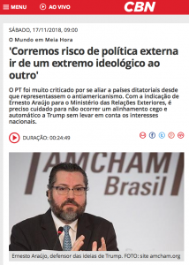 A ideologização da política externa brasileira ameaça, de novo, atropelar os interesses nacionais? Em “O Mundo em Meia Hora”, Roberto Nonato e eu falamos também dos riscos envolvidos no plano de Brexit de Theresa May, da politização dos incêndios da Califórnia, do conflito em Gaza e saída do ministro da Defesa, que pode levar à queda do governo israelense.